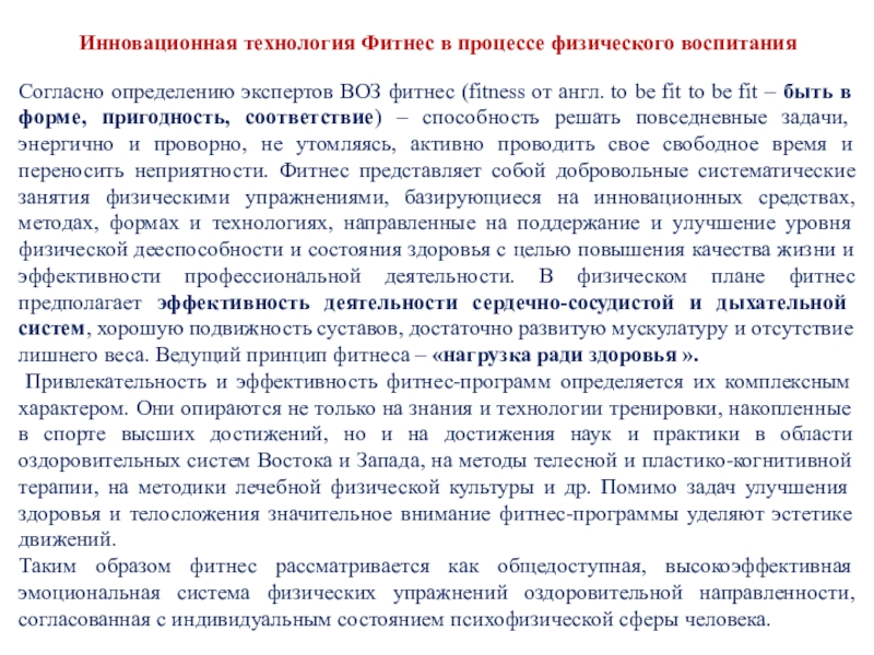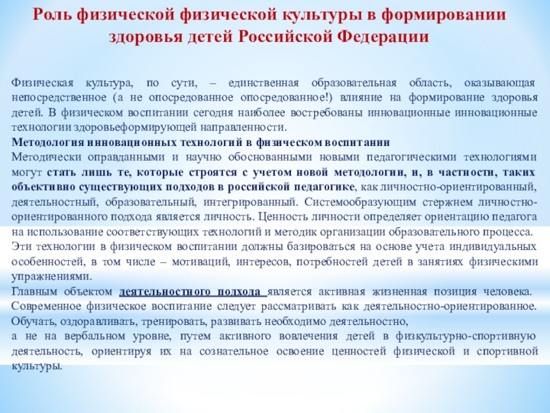 по сути, – единственная образовательная область, оказывающая непосредственное (а не опосредованное опосредованное!) влияние на формирование здоровья детей. В физическом воспитании сегодня наиболее востребованы инновационные инновационные технологии здоровьеформирующей направленности.
