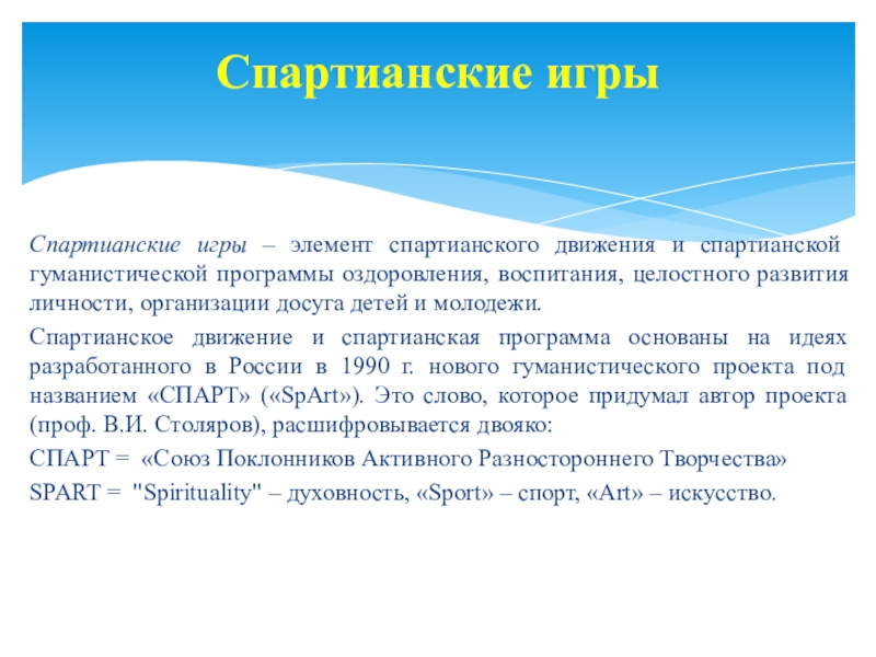Слайд 52Спартианские игры – элемент спартианского движения и спартианской гуманистической программы оздоровления,
