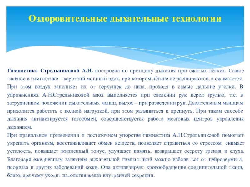Слайд 43Гимнастика Стрельниковой А.Н. построена по принципу дыхания при сжатых лёгких. Самое