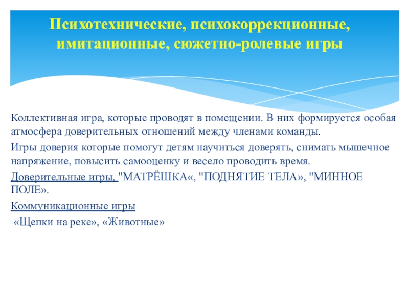 6. Психотехнические, психокоррекционные, имитационные, сюжетно-ролевые и т.п. игры. Доверительные игры, коммуникационные игры