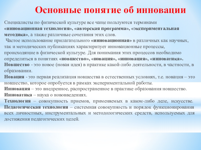 Частое использование прилагательного «инновационная» в различных как научных, так и методических публикациях характеризует инновационные процессы, происходящие в физической культуре. Для понимания этих процессов необходимо определиться в понятиях «новшество», «новация», «инновация», «инноватика».