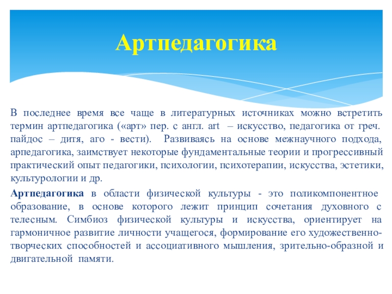 Артпедагогика в области физической культуры - это поликомпонентное образование, в основе которого лежит принцип сочетания духовного с телесным. Симбиоз физической культуры и искусства, ориентирует на гармоничное развитие личности учащегося, формирование его художественно-творческих способностей и ассоциативного мышления, зрительно-образной и двигательной памяти.