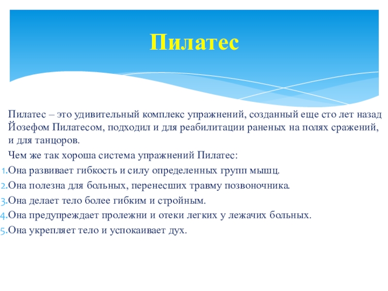 Слайд 45Пилатес – это удивительный комплекс упражнений, созданный еще сто лет назад