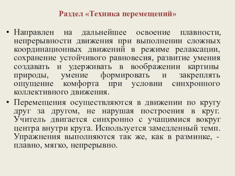 Перемещения осуществляются в движении по кругу друг за другом, не нарушая построения в круг. Учитель двигается синхронно с учащимися вокруг центра внутри круга. Используется замедленный темп. Упражнения выполняются так же, как в разминке, - плавно, мягко, непрерывно.