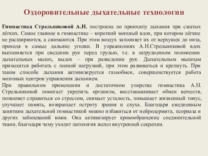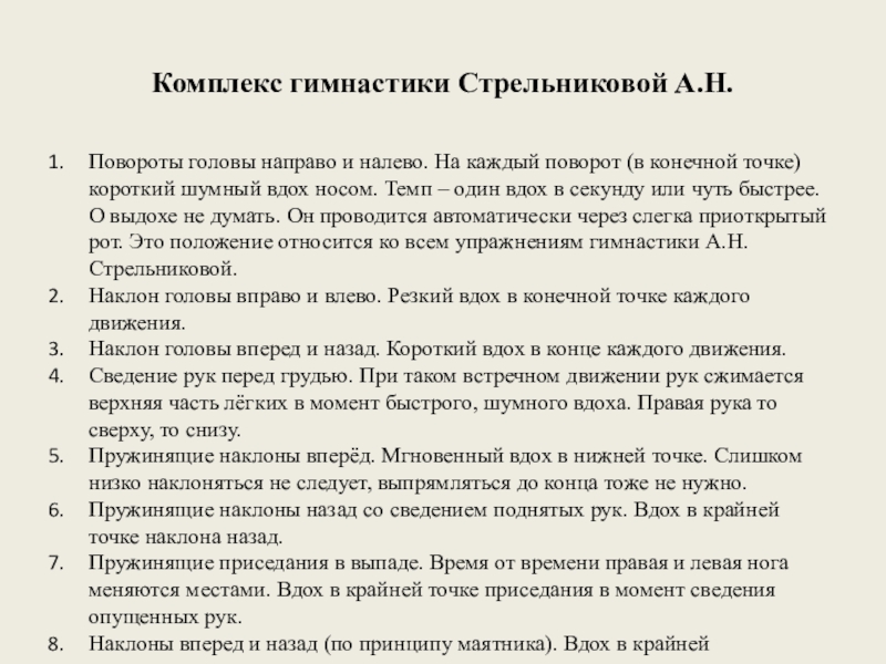 Слайд 7Комплекс гимнастики Стрельниковой А.Н.