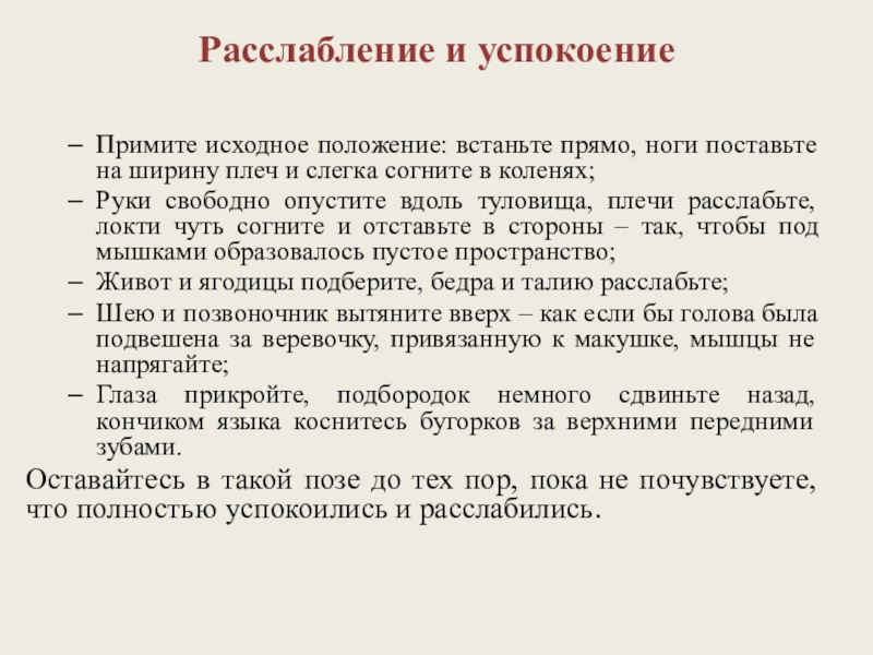 Оставайтесь в такой позе до тех пор, пока не почувствуете, что полностью успокоились и расслабились.