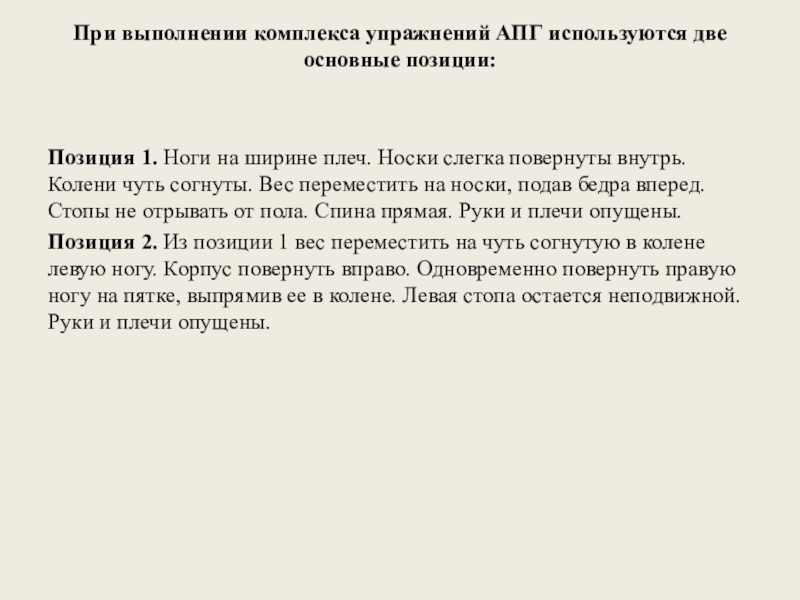 Слайд 16При выполнении комплекса упражнений АПГ используются две основные позиции:
