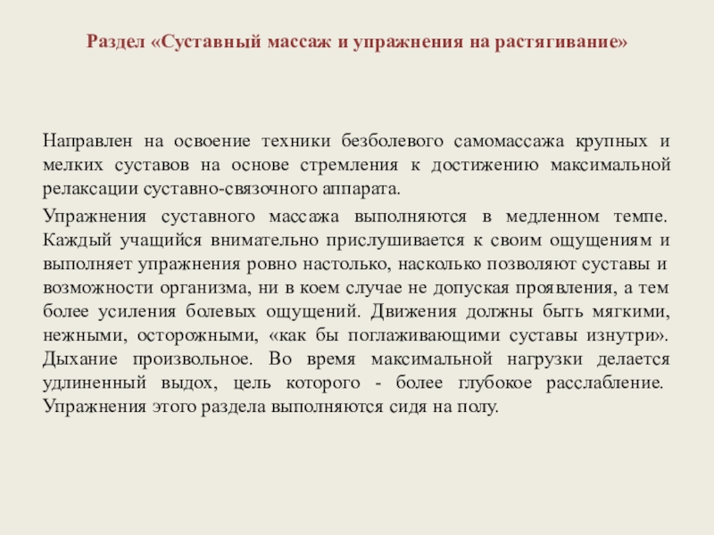 Слайд 18Раздел «Суставный массаж и упражнения на растягивание»