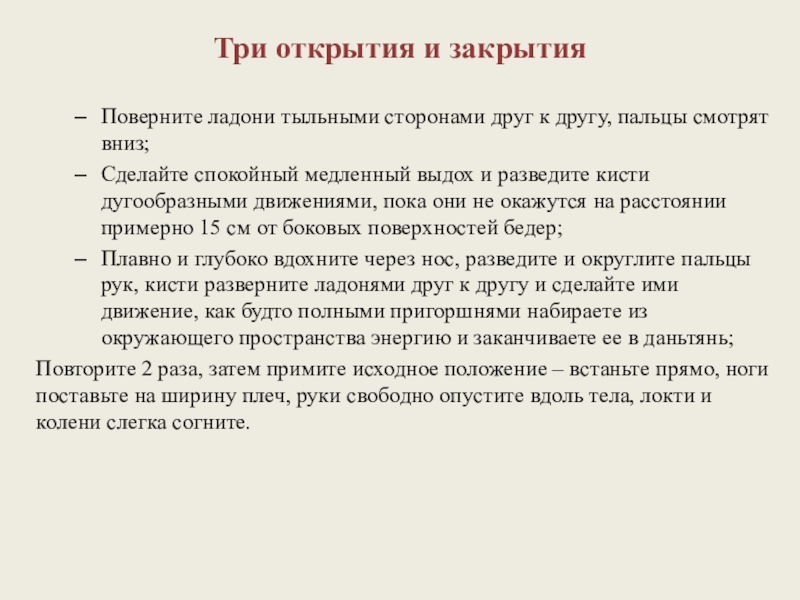 Плавно и глубоко вдохните через нос, разведите и округлите пальцы рук, кисти разверните ладонями друг к другу и сделайте ими движение, как будто полными пригоршнями набираете из окружающего пространства энергию и заканчиваете ее в даньтянь;