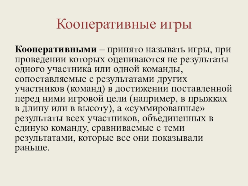 Кооперативными – принято называть игры, при проведении которых оцениваются не