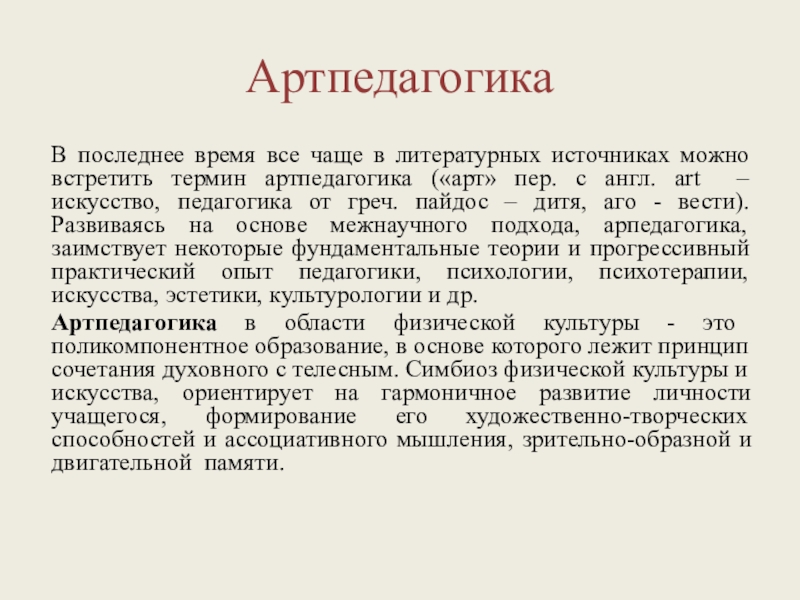 артпедагогика («арт» пер. с англ. art – искусство, педагогика от греч. пайдос – дитя, аго - вести). Развиваясь на основе межнаучного подхода, арпедагогика, заимствует некоторые фундаментальные теории и прогрессивный практический опыт педагогики, психологии, психотерапии, искусства, эстетики, культурологии и др.