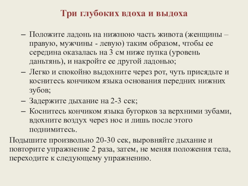 – правую, мужчины - левую) таким образом, чтобы ее середина оказалась на 3 см ниже пупка (уровень даньтянь), и накройте ее другой ладонью;