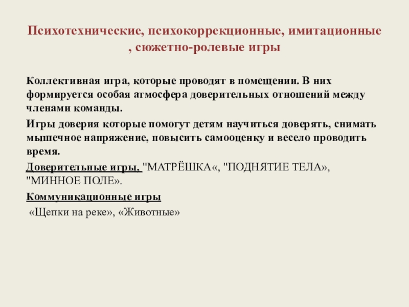 Слайд 33Психотехнические, психокоррекционные, имитационные , сюжетно-ролевые игры
