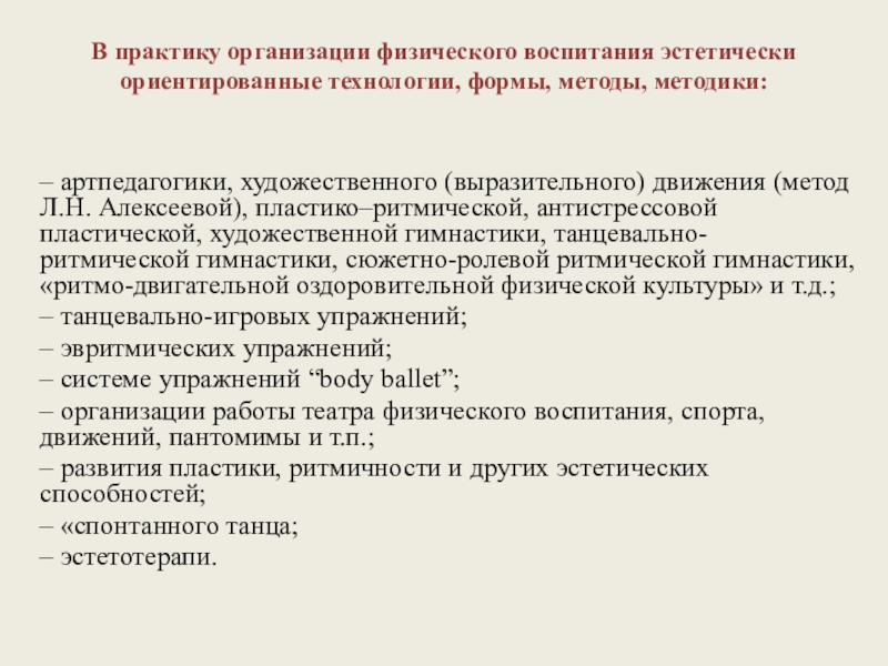 артпедагогики, художественного (выразительного) движения (метод Л.Н. Алексеевой), пластико–ритмической, антистрессовой пластической, художественной гимнастики, танцевально-ритмической гимнастики, сюжетно-ролевой ритмической гимнастики, «ритмо-двигательной оздоровительной физической культуры» и т.д.;