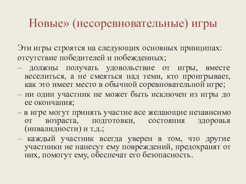 – должны получать удовольствие от игры, вместе веселиться, а не смеяться над теми, кто проигрывает, как это имеет место в обычной соревновательной игре;