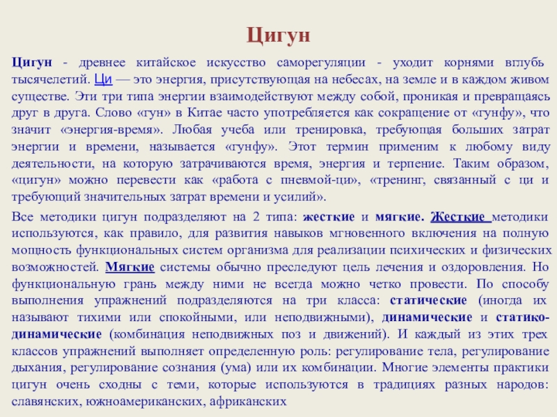 Все методики цигун подразделяют на 2 типа: жесткие и мягкие. Жесткие методики используются, как правило, для развития навыков мгновенного включения на полную мощность функциональных систем организма для реализации психических и физических возможностей. Мягкие системы обычно преследуют цель лечения и оздоровления. Но функциональную грань между ними не всегда можно четко провести. По способу выполнения упражнений подразделяются на три класса: статические (иногда их называют тихими или спокойными, или неподвижными), динамические и статико-динамические (комбинация неподвижных поз и движений). И каждый из этих трех классов упражнений выполняет определенную роль: регулирование тела, регулирование дыхания, регулирование сознания (ума) или их комбинации. Многие элементы практики цигун очень сходны с теми, которые используются в традициях разных народов: славянских, южноамериканских, африканских