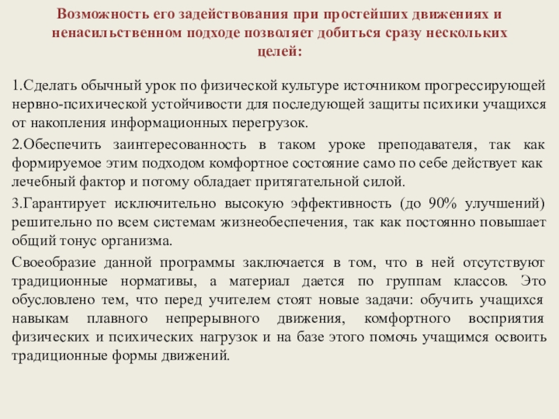 Слайд 13Возможность его задействования при простейших движениях и ненасильственном подходе позволяет добиться