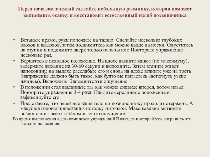 Шею и позвоночник вытяните вверх – как если бы голова была подвешена за веревочку, привязанную к макушке, мышцы не напрягайте;