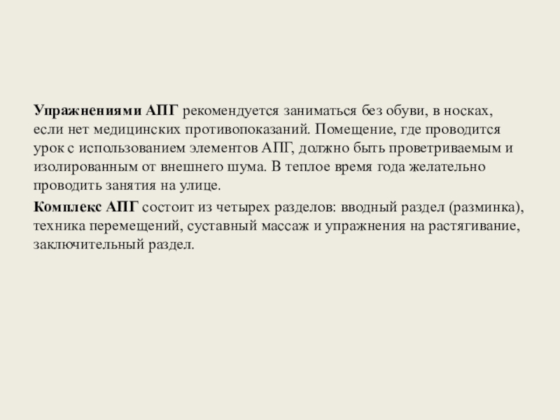 Упражнениями АПГ рекомендуется заниматься без обуви, в носках, если нет медицинских