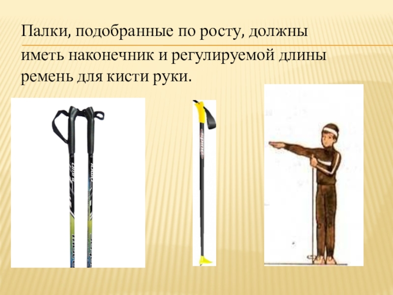Палки, подобранные по росту, должны иметь наконечник и регулируемой длины ремень для кисти руки.