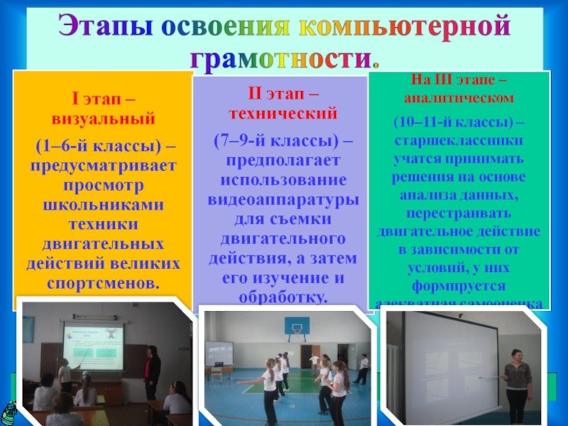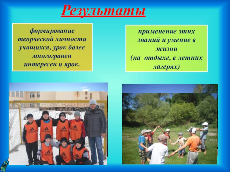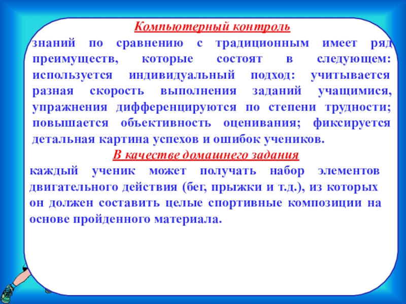 каждый ученик может получать набор элементов двигательного действия (бег, прыжки и т.д.), из которых он должен составить целые спортивные композиции на основе пройденного материала.
