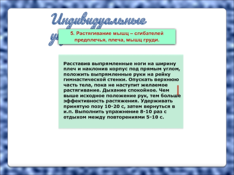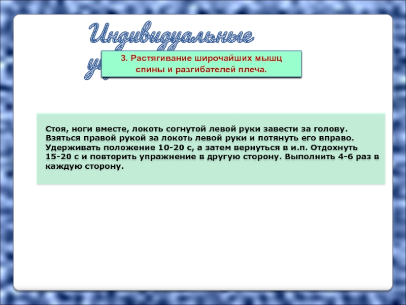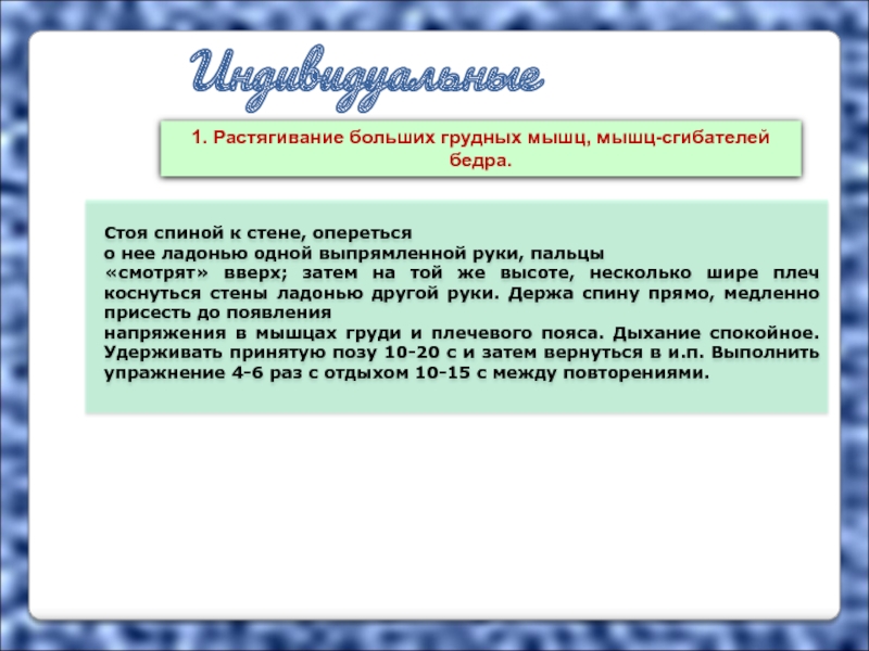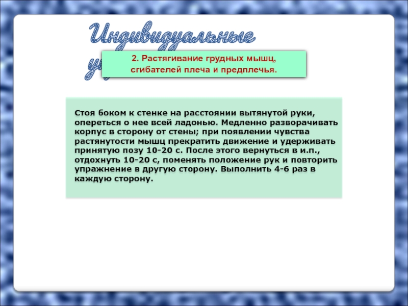 2. Растягивание грудных мышц, сгибателей плеча и предплечья.