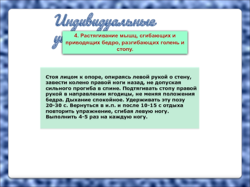 4. Растягивание мышц, сгибающих и приводящих бедро, разгибающих голень и стопу.