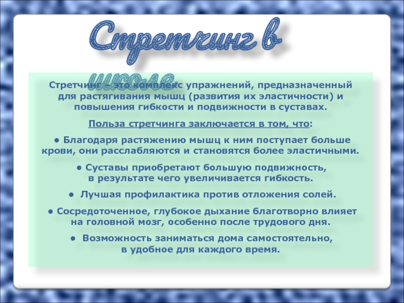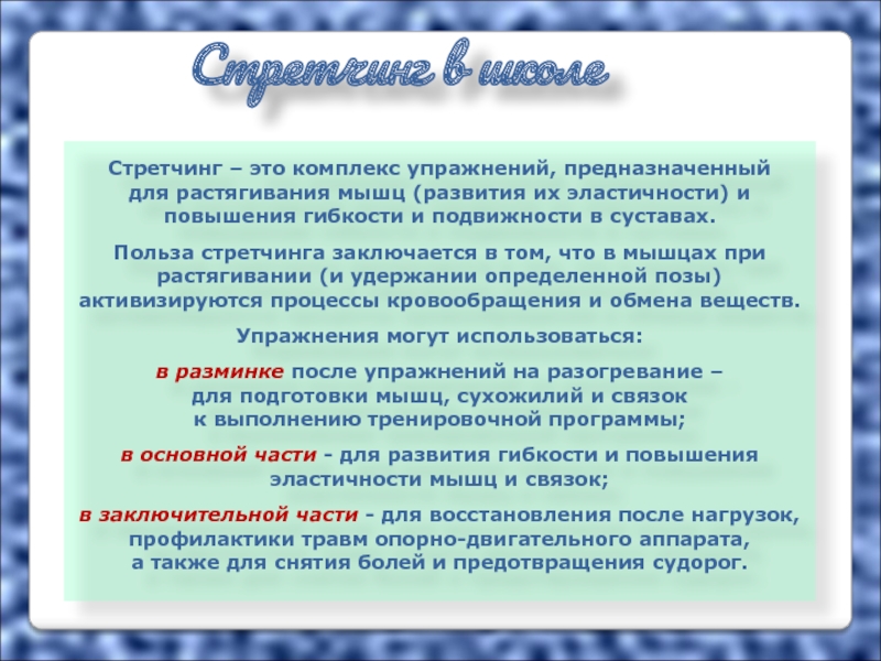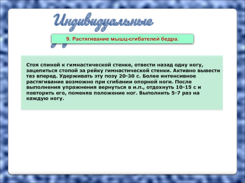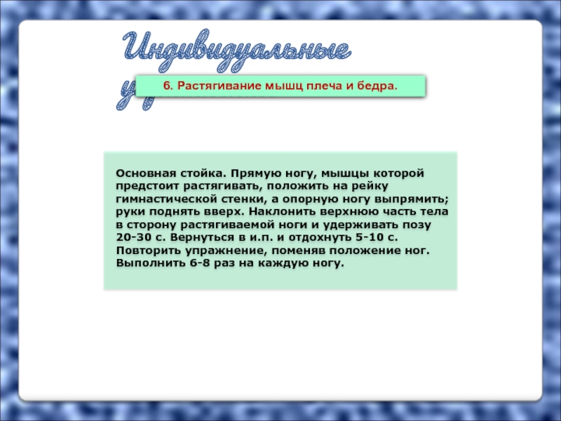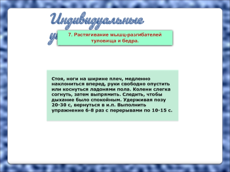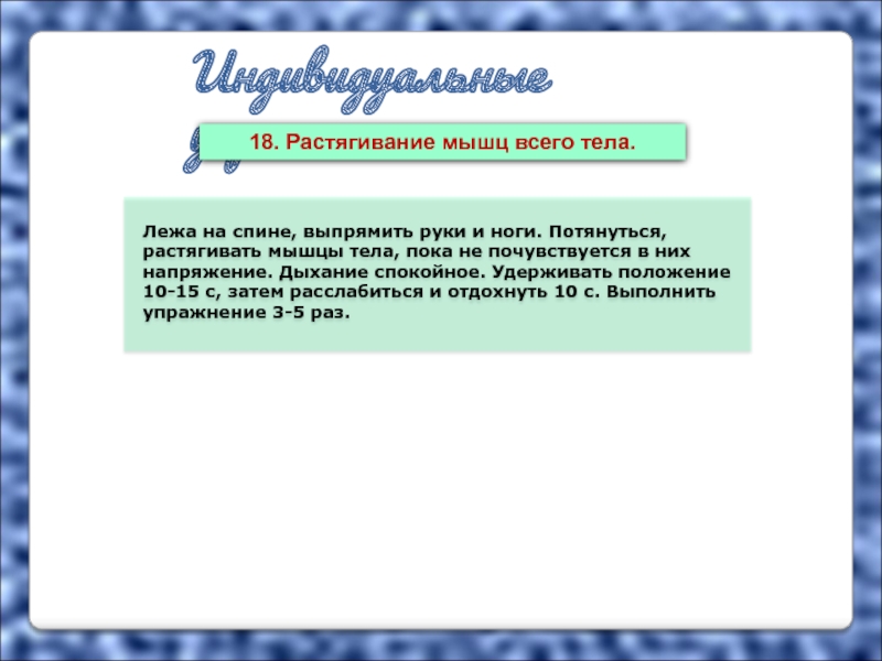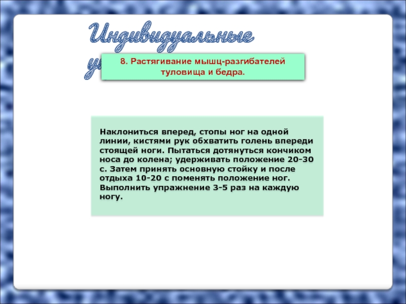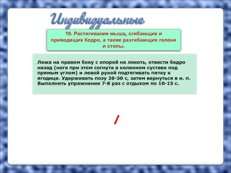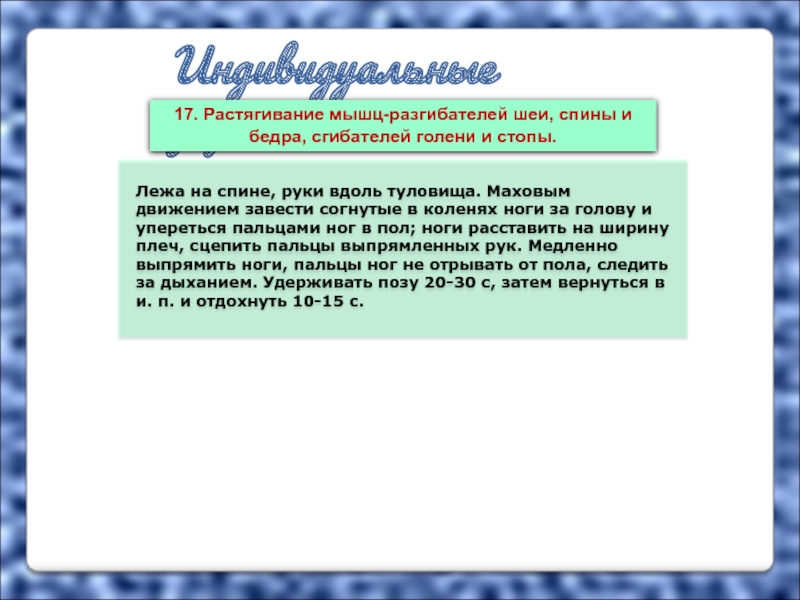 17. Растягивание мышц-разгибателей шеи, спины и бедра, сгибателей голени и стопы.