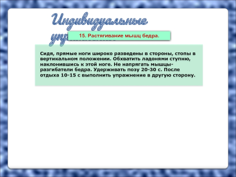 16. Растягивание мышц, сгибающих и приводящих бедро, а также разгибающих голени и стопы.