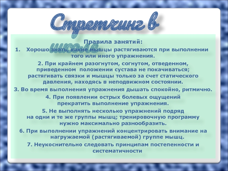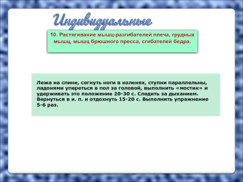 10. Растягивание мышц-разгибателей плеча, грудных мышц, мышц брюшного пресса, сгибателей бедра.