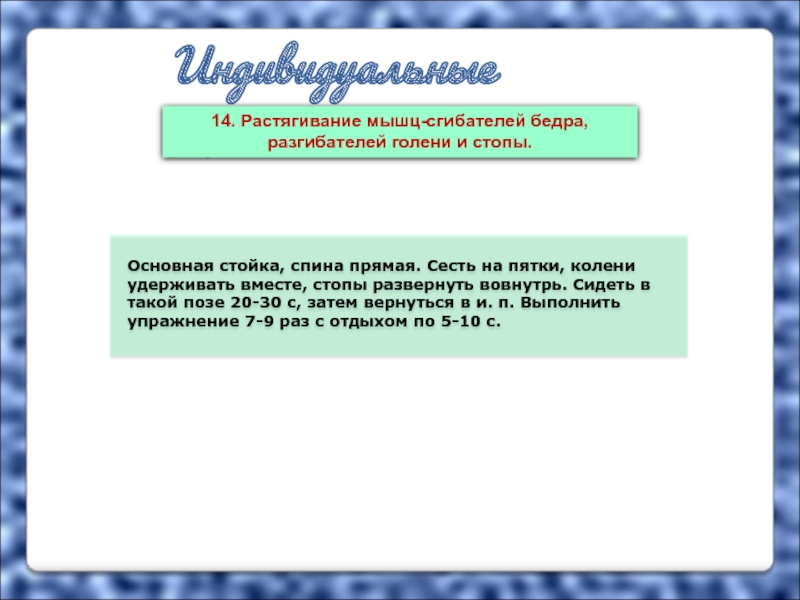 14. Растягивание мышц-сгибателей бедра, разгибателей голени и стопы.