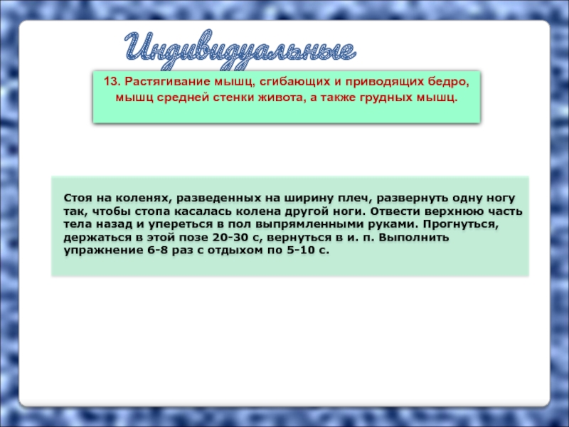 13. Растягивание мышц, сгибающих и приводящих бедро, мышц средней стенки живота, а также грудных мышц.