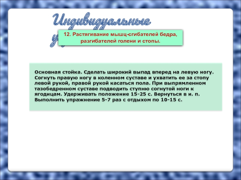 12. Растягивание мышц-сгибателей бедра, разгибателей голени и стопы.