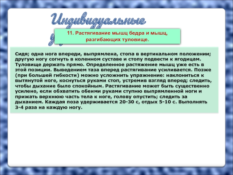 11. Растягивание мышц бедра и мышц, разгибающих туловище.