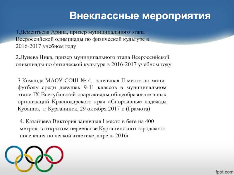 3.Команда МАОУ СОШ № 4, занявшая II место по мини-футболу среди девушек 9-11 классов в муниципальном этапе IX Всекубанской спартакиады общеобразовательных организаций Краснодарского края «Спортивные надежды Кубани», г. Курганинск, 29 октября 2017 г. (Грамота)