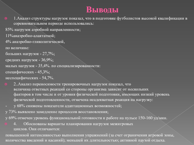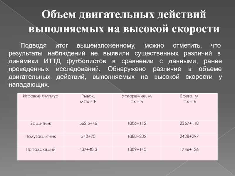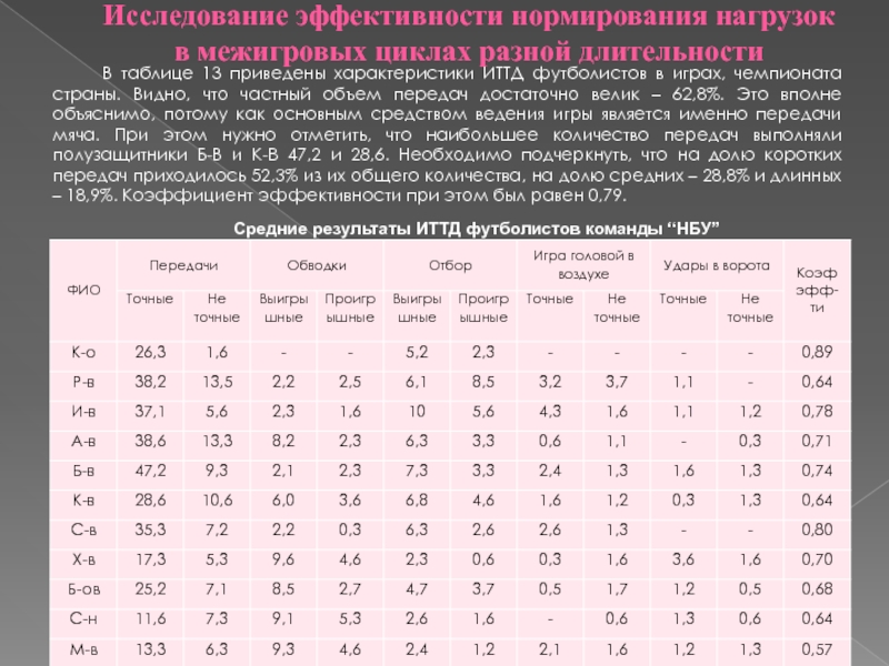 В таблице 13 приведены характеристики ИТТД футболистов в играх, чемпионата страны. Видно, что частный объем передач достаточно велик – 62,8%. Это вполне объяснимо, потому как основным средством ведения игры является именно передачи мяча. При этом нужно отметить, что наибольшее количество передач выполняли полузащитники Б-В и К-В 47,2 и 28,6. Необходимо подчеркнуть, что на долю коротких передач приходилось 52,3% из их общего количества, на долю средних – 28,8% и длинных – 18,9%. Коэффициент эффективности при этом был равен 0,79.