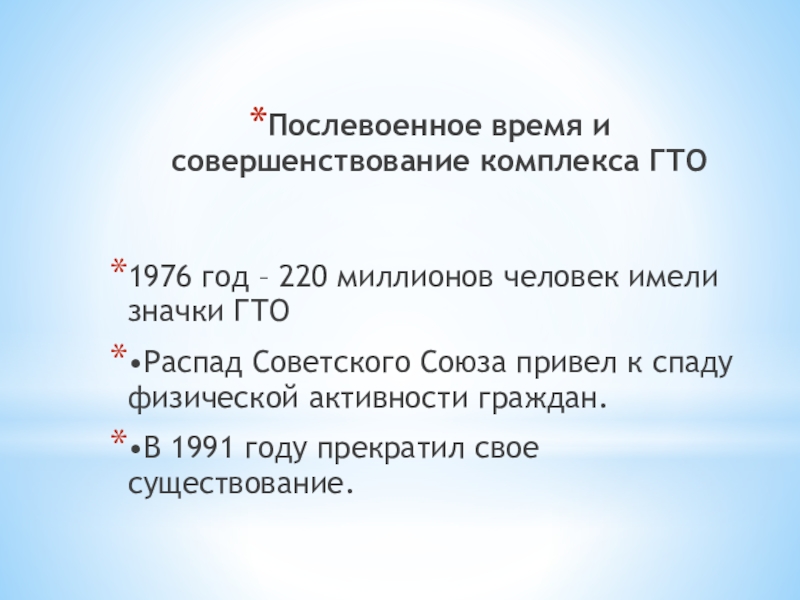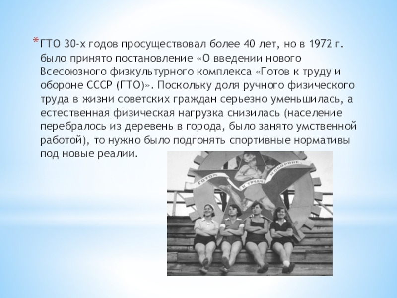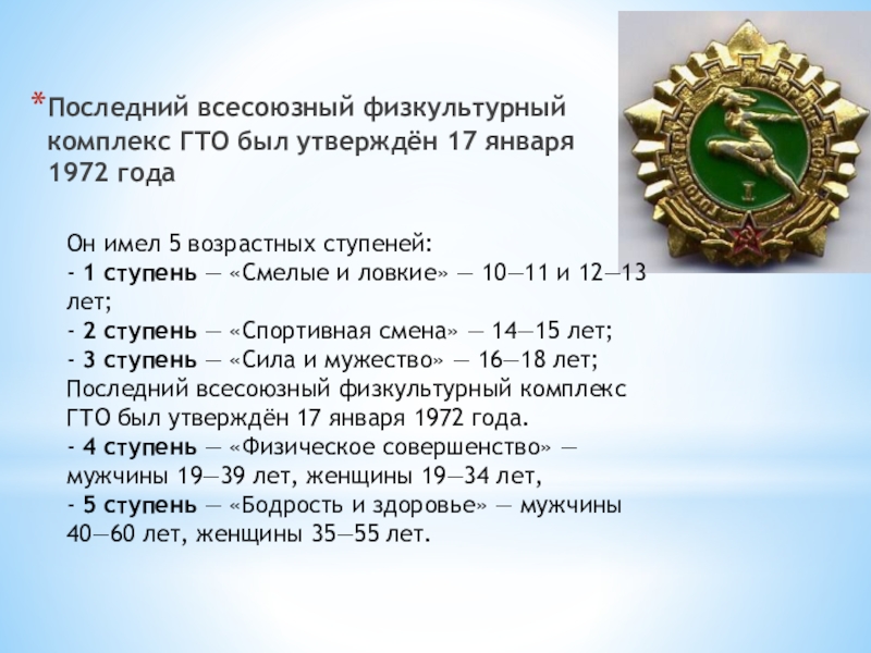Последний всесоюзный физкультурный комплекс ГТО был утверждён 17 января 1972 года.