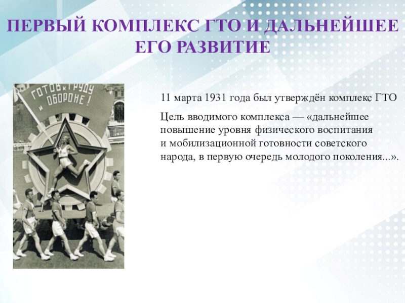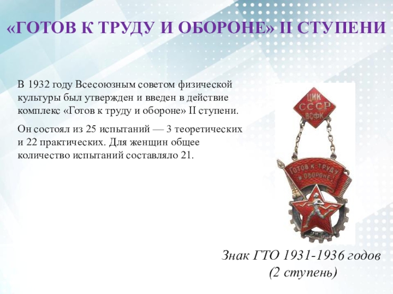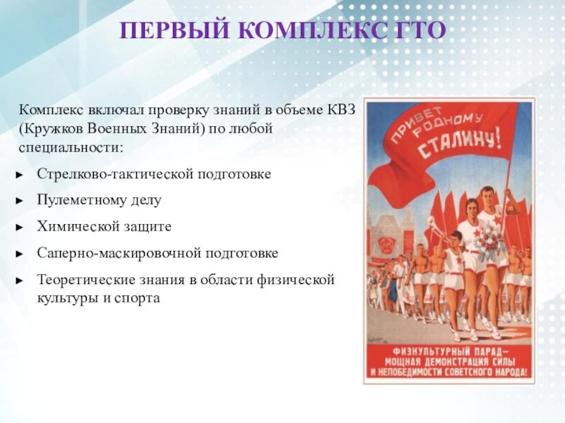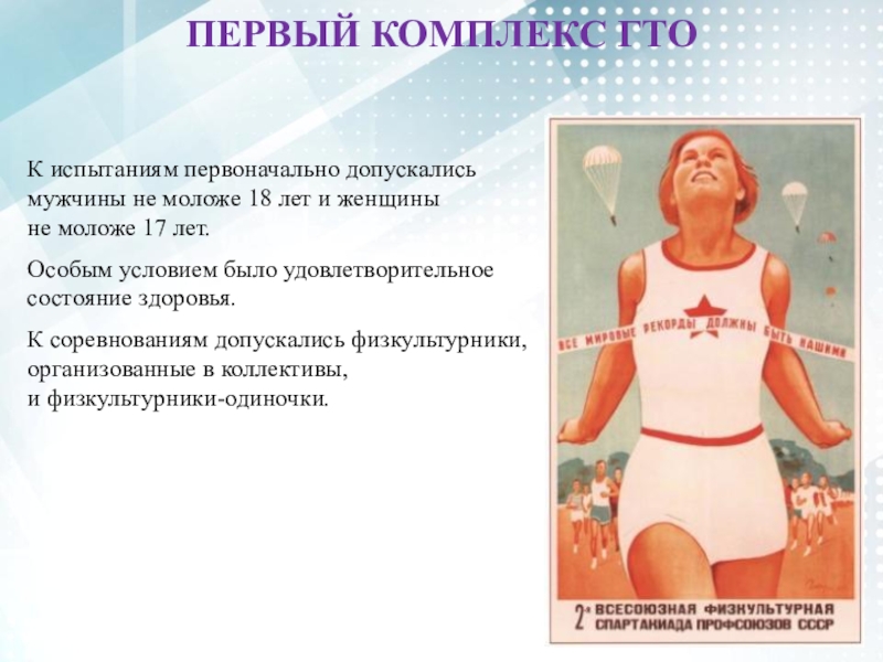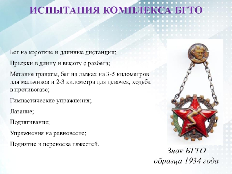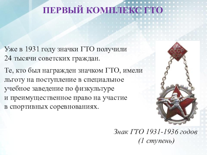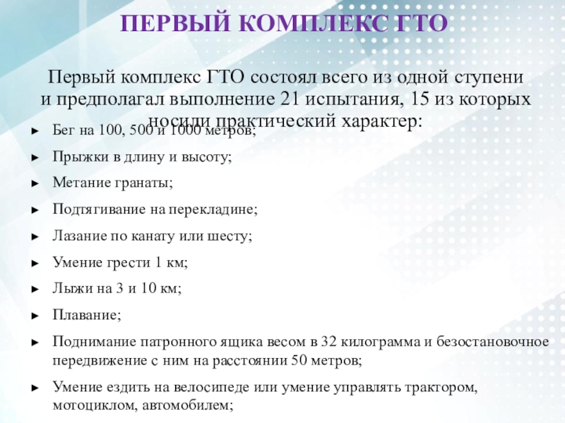 Первый комплекс ГТО состоял всего из одной ступени и предполагал выполнение 21 испытания, 15 из которых носили практический характер: