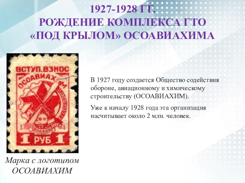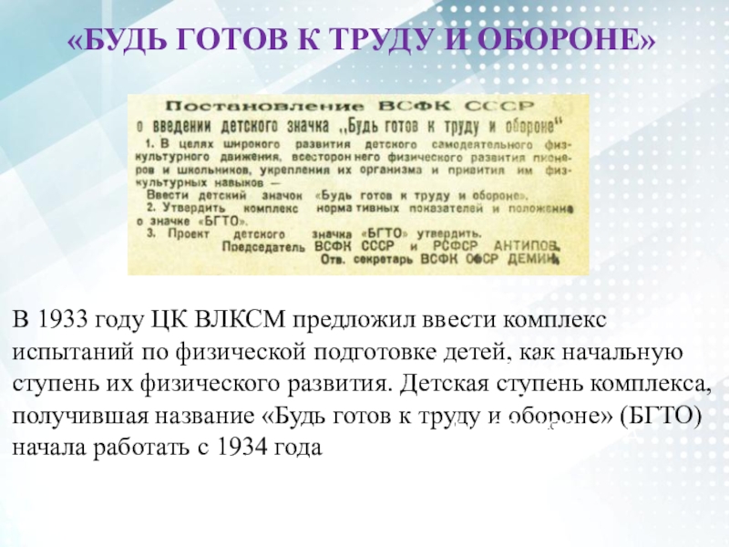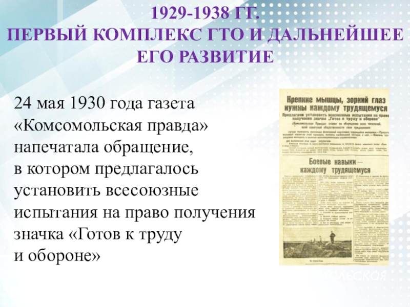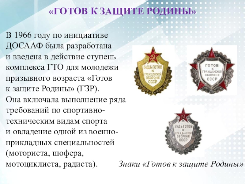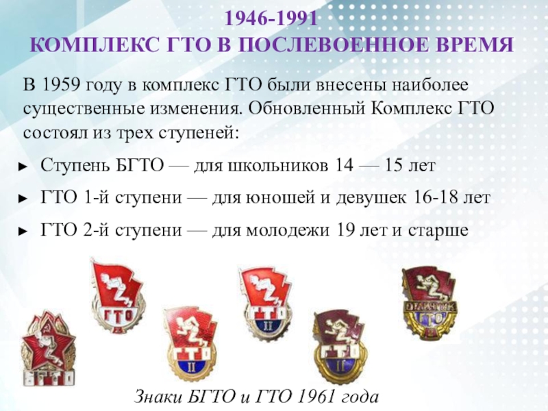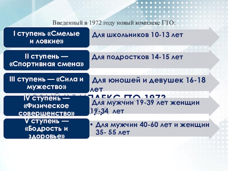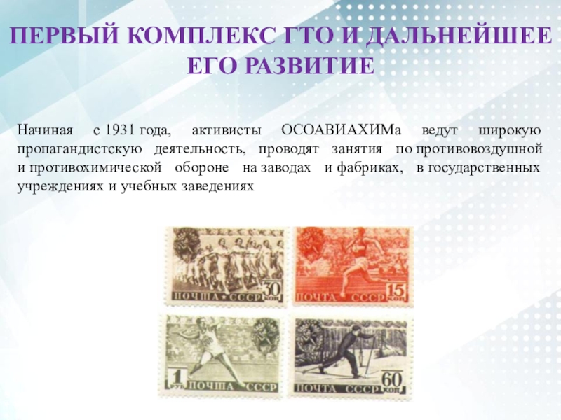 Первый комплекс ГТО состоял всего из одной ступени и предполагал выполнение 21 испытания, 15 из которых носили практический характер: