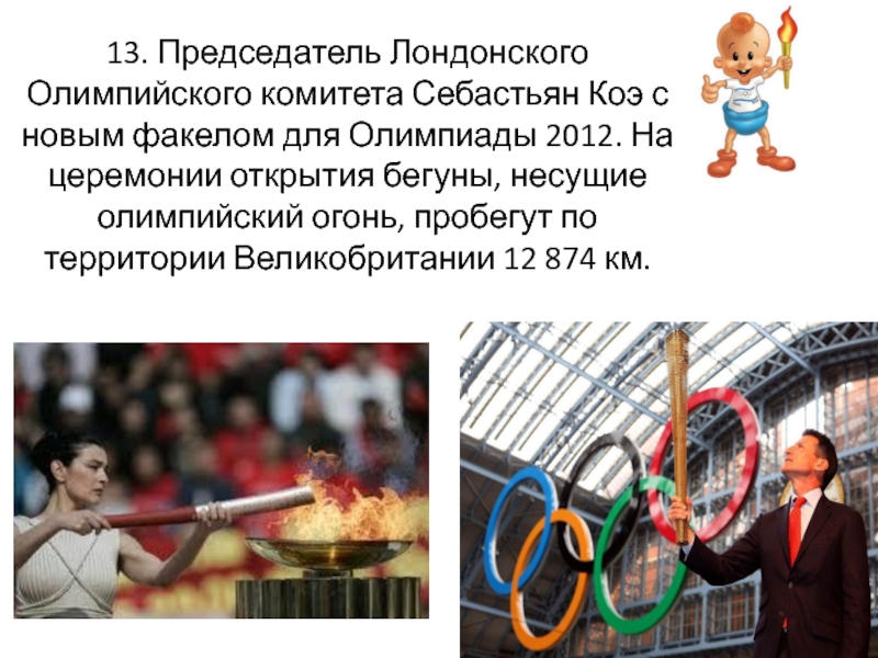 13. Председатель Лондонского Олимпийского комитета Себастьян Коэ с новым факелом для
