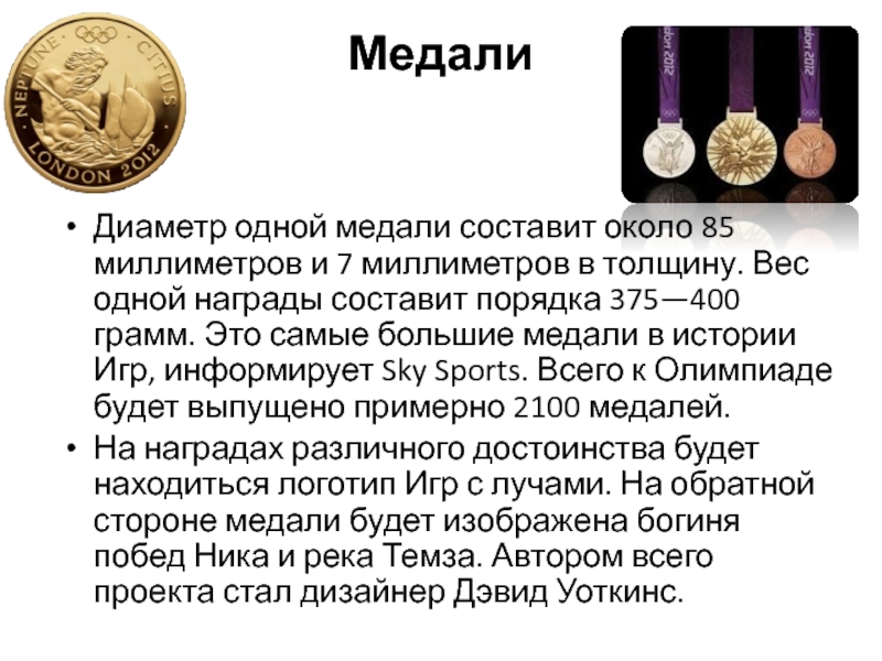 толщину. Вес одной награды составит порядка 375—400 грамм. Это самые большие медали в истории Игр, информирует Sky Sports. Всего к Олимпиаде будет выпущено примерно 2100 медалей.