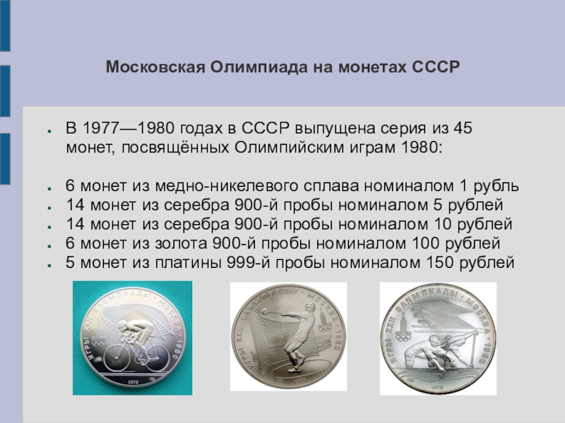 Слайд 7Московская Олимпиада на монетах СССР