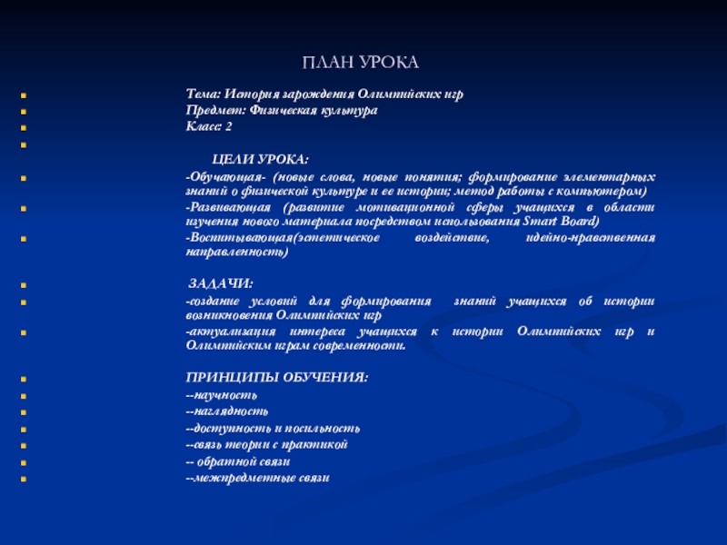 -Обучающая- (новые слова, новые понятия; формирование элементарных знаний о физической культуре и ее истории; метод работы с компьютером)