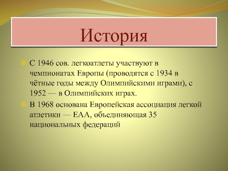 С 1946 сов. легкоатлеты участвуют в чемпионатах Европы (проводятся с 1934
