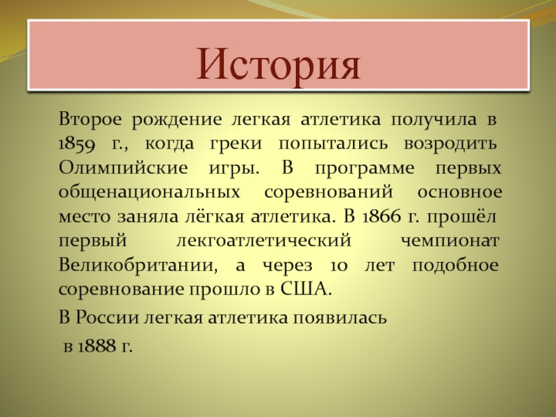 возродить Олимпийские игры. В программе первых общенациональных соревнований основное место заняла лёгкая атлетика. В 1866 г. прошёл первый лекгоатлетический чемпионат Великобритании, а через 10 лет подобное соревнование прошло в США.