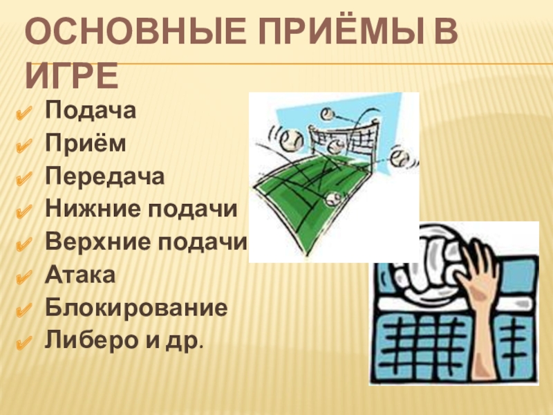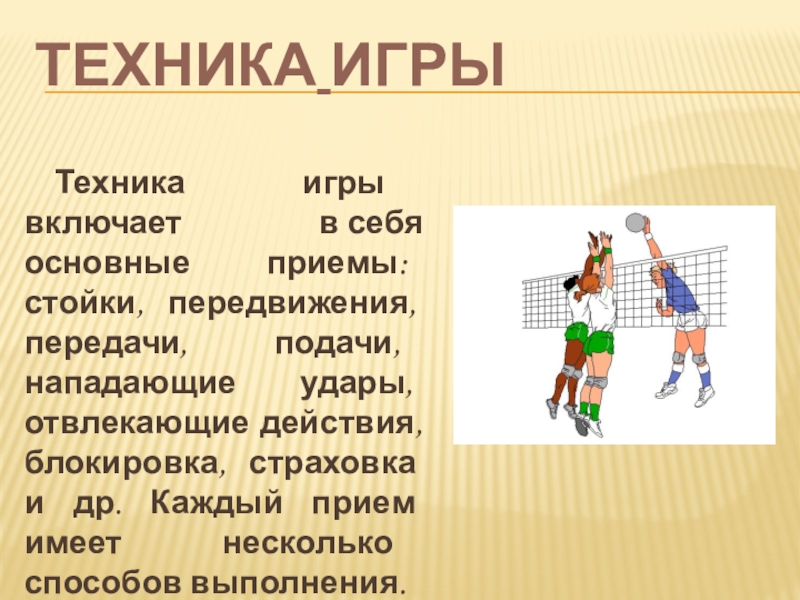 в себя основные приемы: стойки, передвижения, передачи, подачи, нападающие удары, отвлекающие действия, блокировка, страховка и др. Каждый прием имеет несколько способов выполнения.