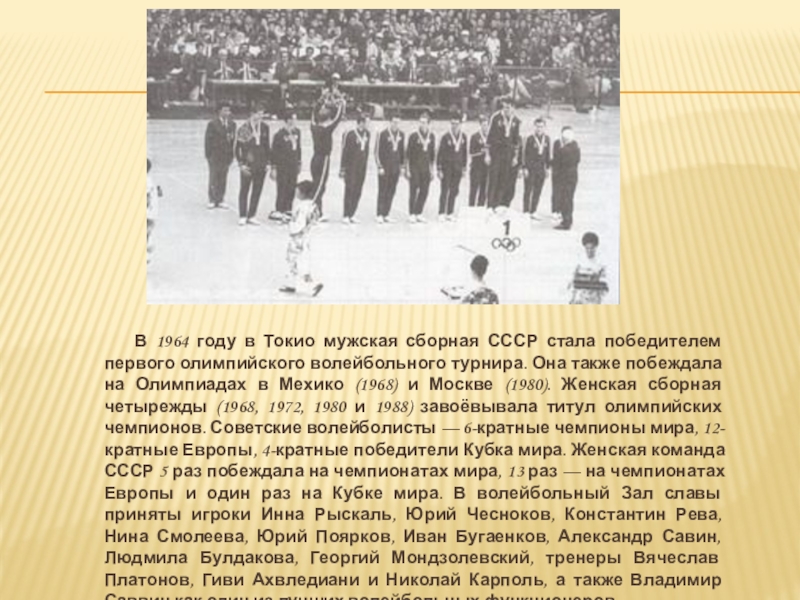Слайд 6В 1964 году в Токио мужская сборная СССР стала победителем первого