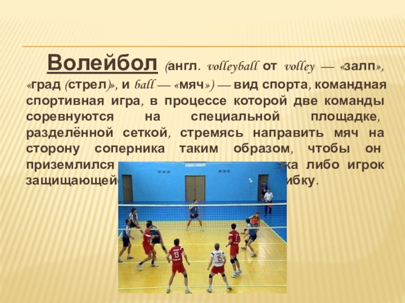 Слайд 2 Волейбол (англ. volleyball от volley — «залп», «град (стрел)», и