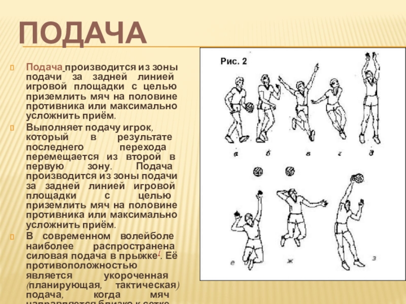 Выполняет подачу игрок, который в результате последнего перехода перемещается из второй в первую зону. Подача производится из зоны подачи за задней линией игровой площадки с целью приземлить мяч на половине противника или максимально усложнить приём.