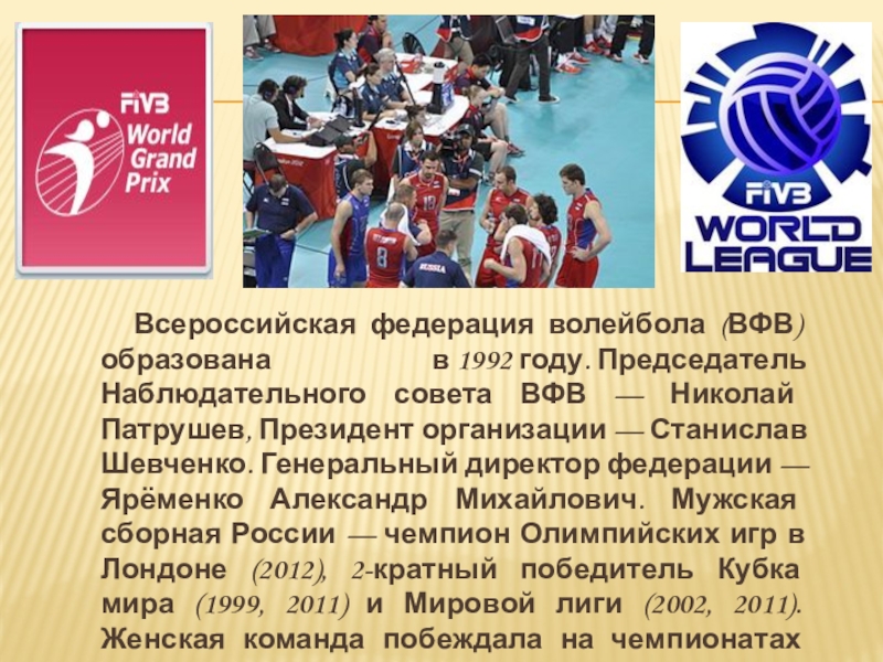 в 1992 году. Председатель Наблюдательного совета ВФВ — Николай Патрушев, Президент организации — Станислав Шевченко. Генеральный директор федерации — Ярёменко Александр Михайлович. Мужская сборная России — чемпион Олимпийских игр в Лондоне (2012), 2-кратный победитель Кубка мира (1999, 2011) и Мировой лиги (2002, 2011). Женская команда побеждала на чемпионатах мира 2006 и 2010 годов, чемпионатах Европы (1993, 1997, 1999, 2001), Гран-при (1997, 1999, 2002), Всемирном Кубке чемпионов (1997).